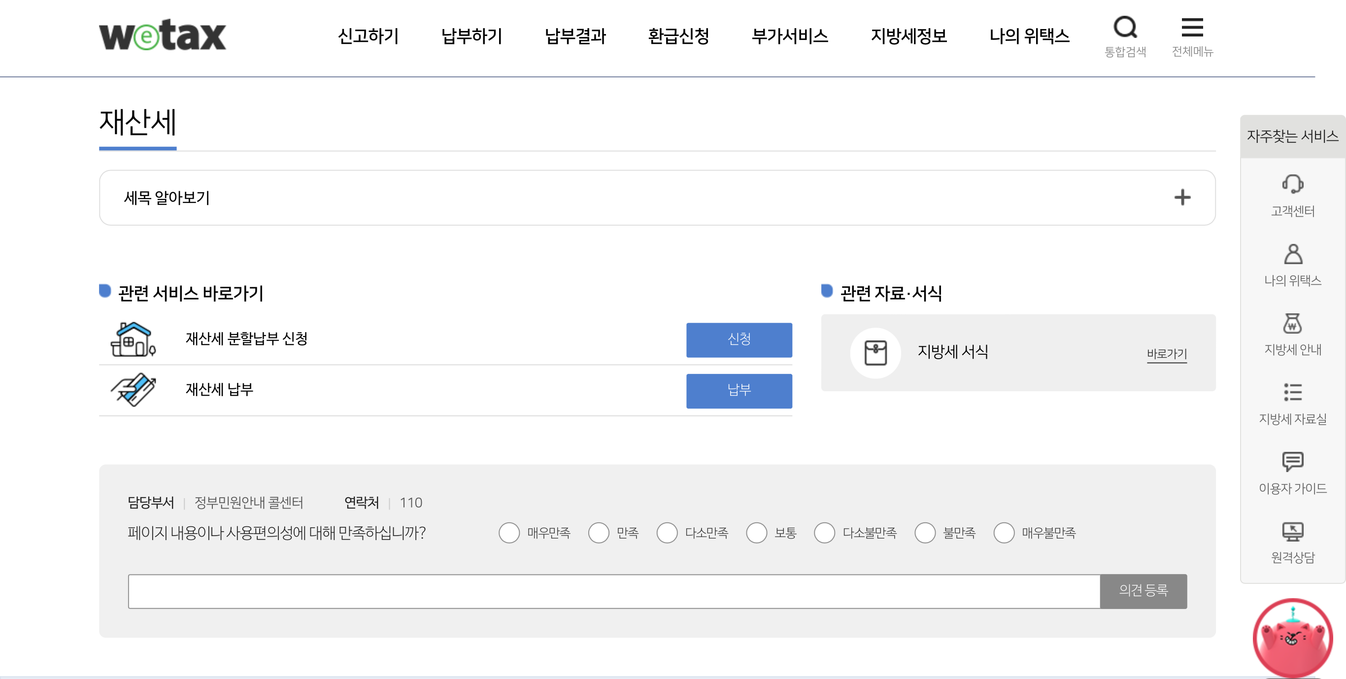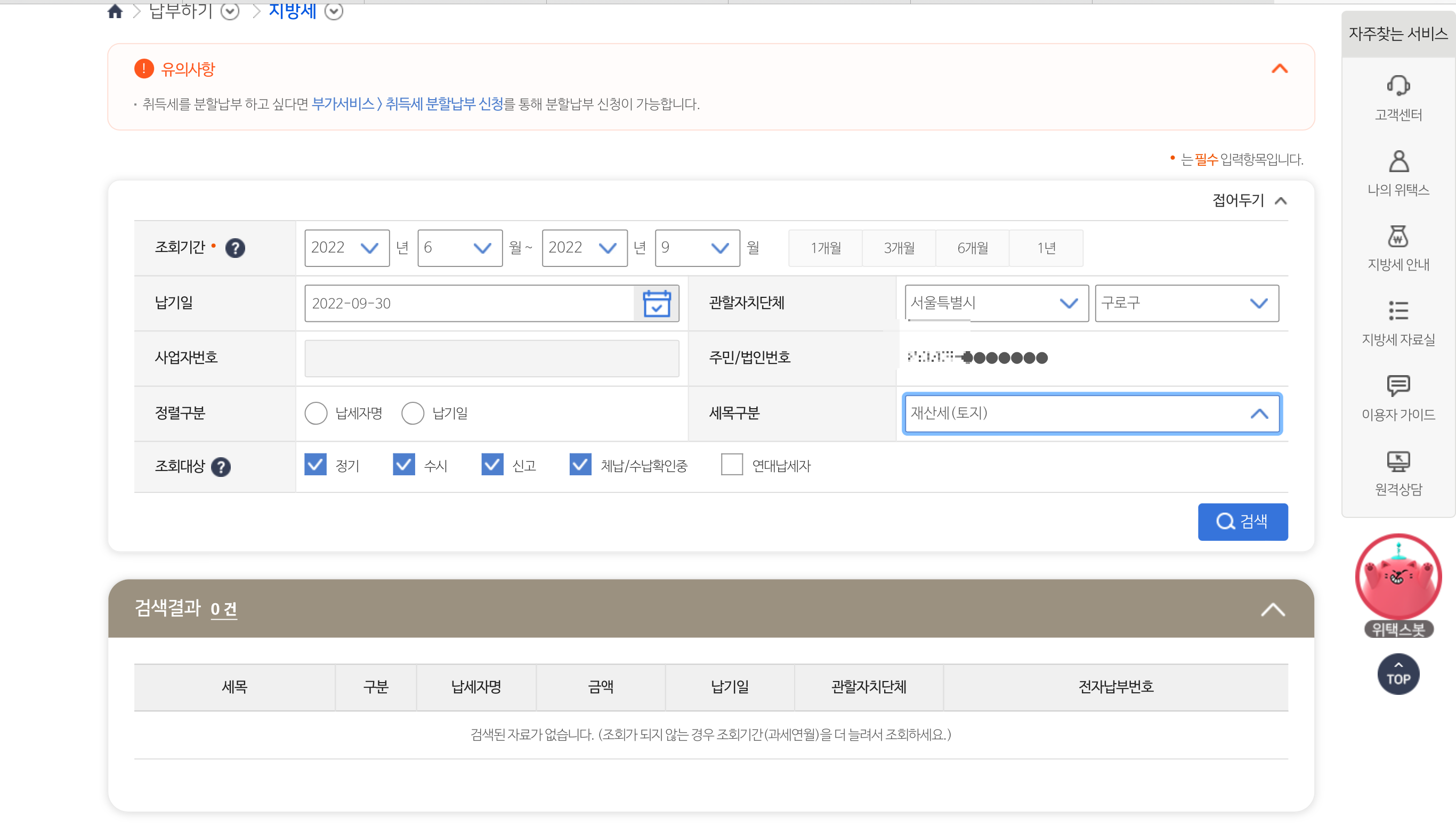 위택스에 홈페이지에서 지방세 바로가기의 재산세를 클릭한 후 납부 버튼을 누른 후 로그인합니다. 조회 기간, 납기일, 세목 구분 등을 선택하고 검색 버튼을 누르면 납부해야 하는 지방세(재산세 포함)를 확인하고 납부할 수 있습니다.
