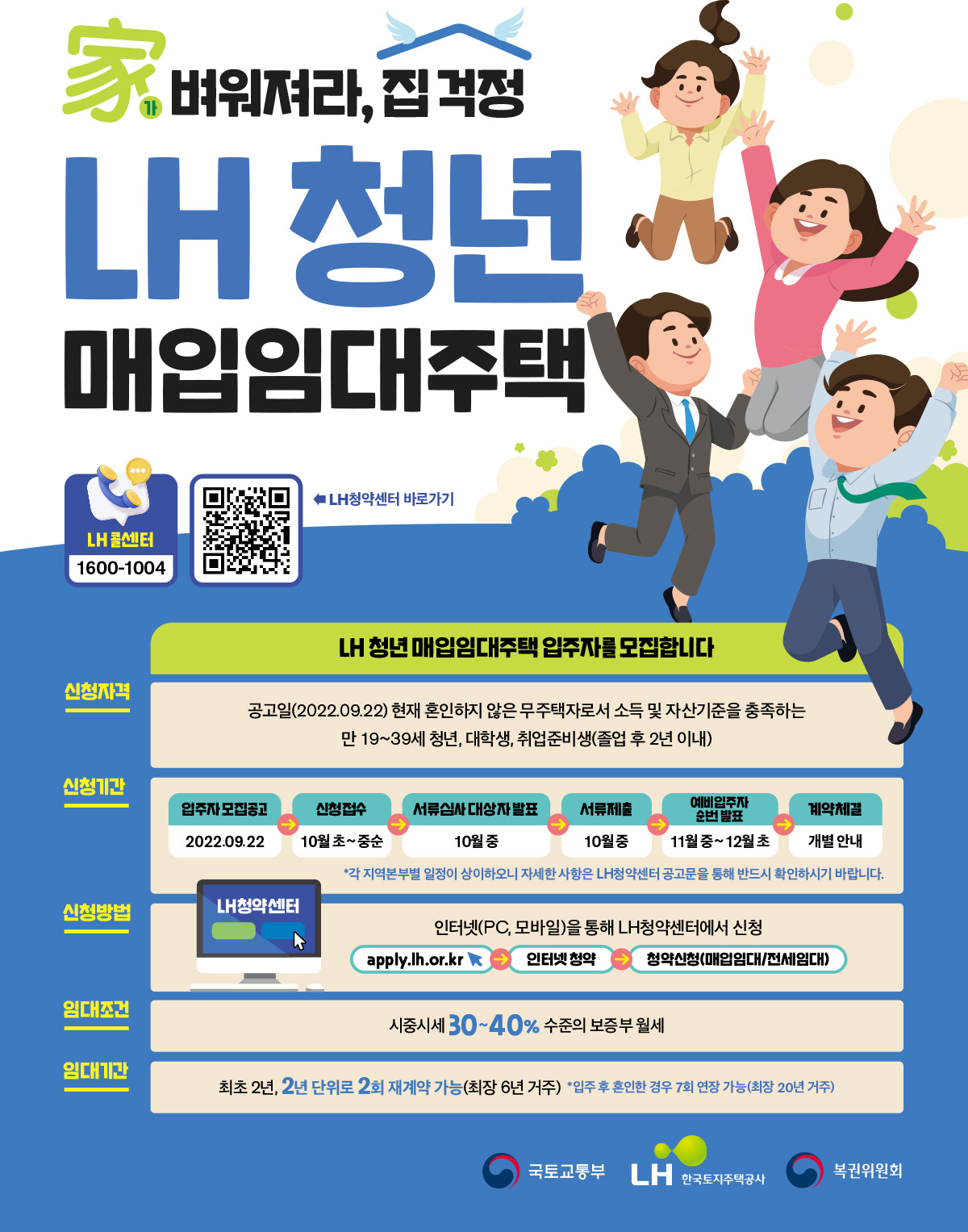 2022년 9월 22일, 전국 16개 시도에서 청년 및 신혼부부를 위한 매입 임대주택 3차 입주자 모집이 공고되었습니다. 매입 임대주택은 LH가 도심 내 신축 및 기존 주택을 매입해 시세보다 저렴한 임대조건으로 임대하는 공공임대주택으로, 10월 접수 후, 자격 검증을 거치면 12월 말부터 입주할 수 있다고 하니 해당되는 분들은 확인하셔서 꼭 신청하시기 바랍니다.